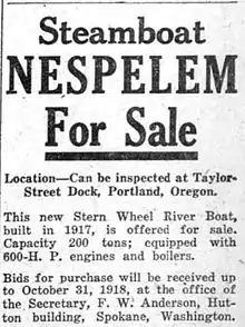- 1 2 "Steamboat NESPELEM for Sale". Morning Oregonian (Advertisement). Vol. 58, no. 18, 066. Portland, OR. October 18, 1918. p.15, col.7.