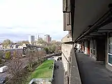 The flats themselves were a mixture of single-storey apartments and two-storey maisonettes, with two to six bedrooms. The maisonettes were designed with the bedrooms facing inwards shielding the residents from the traffic noise. Another design feature was the wide balconies (the "streets") on every third floor, the concept being to provide public space which would encourage interaction. Alcoves called "pause spaces" were provided next to the entrance doorways on the "streets" which the Smithsons hoped the residents would personalise and where children would play.[1] As with many other council housing blocks in the United Kingdom, tenures diversified somewhat and included social housing tenants, leaseholders who exercised the right to buy and subsequent private owners, and private tenants of leaseholders.[8]