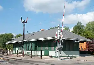Throughout the railroads' presence, the depot has had several names. At first it was named Scottsville, for the nearby village. Once a railroad was built through Scottsville, the name of the depot was changed to Oatka, named for Oatka Creek, which flows into the nearby Genesee River. In 1902, the "State Agricultural & Industrial School," a school for troubled boys, relocated to the Town of Rush.[2] When the current depot was constructed in about 1909, the name was changed to Industry, to reflect the small community that the School had created.