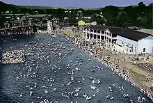 Rock Lake Pool was an outdoor swimming pool located in South Charleston, West Virginia operating from 1942 to 1985.[1] Being 550 feet (170 m) long, it was billed as "the largest and most beautiful pool in the East."[1] The pool was built in an old rock quarry in the 1930s[2] and opened by Joe, David, and Sam Wilan in 1942.[3] The pool was enclosed by tall natural rock walls that provided high dives. The pool was very popular in both West Virginia and neighboring states[4] and on one occasion, even drew a crowd of around 4,000 swimmers in one day.[4] After a long decline, the historic pool eventually closed in 1985 due to increased insurance cost[5] and competition from other pools.[1] The site is now owned by Rock Lake Presbyterian Church.[1]