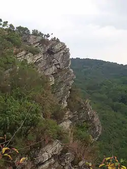 The reputation of this precipice is founded on its breathtaking sheer drop: 118 metres (387 ft).[1] Neither tourists nor locals expect this kind of natural feature in Normandy. It is considered the most mountainous part of the region, even though not the highest, and it has become, over time, one of the main attractions in Normandy. It is also a popular lookout that gives a broad survey of the wooded groves of the Rouvre, the fast-flowing river in the valley, which can be reached by steps hewn from the rock. The natural surroundings are full with granite rocks, ravines, heath and thicket. Many visitors come to find a calm place for their contemplation and meditation.