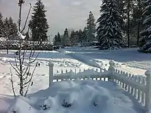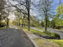 Within the neighborhood is the Rockwood Historic District, which is listed on the National Register of Historic Places. The district is about two blocks wide between Hatch and Arthur streets from 29th Avenue on the south to 14th Avenue on the north, from which it continues turns to the northwest and continues to the northwesternmost corner of the neighborhood.[2] This area of the neighborhood was designed by noted landscape architects, the Olmsted Brothers.[3] It features streets that curve around exposed basalt outcroppings and through old ponderosa pine and Douglas fir forest as they wind their way up the hill from downtown. The Olmsteds were fond of diagonal streets such as Southeast Boulevard that borders the neighborhood. The Rockwood neighborhood borders two of the city's larger parks, Manito Park to the west and Lincoln Park to the east, but does not contain any true parks within its boundaries.[4] However, in the Rockwood Historic Districts, four small grassy islands are located on Garfield Road and Rockwood Boulevard, known as the Olmsted Triangle Parks, as well as a pair of grassy boulevards that intersect at the intersection of Upper Terrace Road and Rockwood and Highland Boulevards.[5][6] The neighborhood's terrain is reflected in many of the street names, like the aforementioned Rockwood, Highland and Upper Terrace, as well as Crest Road and Overbluff Drive.[7]
