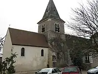 The church is still on the hill where the historical commune stood and now dominate the village. It was dated 12th century, but the structure was modified many times. The church has kept his Romanesque porch. It is a listed monument.[6] The most remarkable possession of the church is a painting called Les Pèlerins d'Emmaüs from 1757 and designated as historical monument in 1908. It was painted by Adrien Le Beau after Pilgrims at Emmaus by Titian.[7] The bell has a diameter of 1.20 m and is from 1699.[8] It has been dubbed Isabelle.[9]