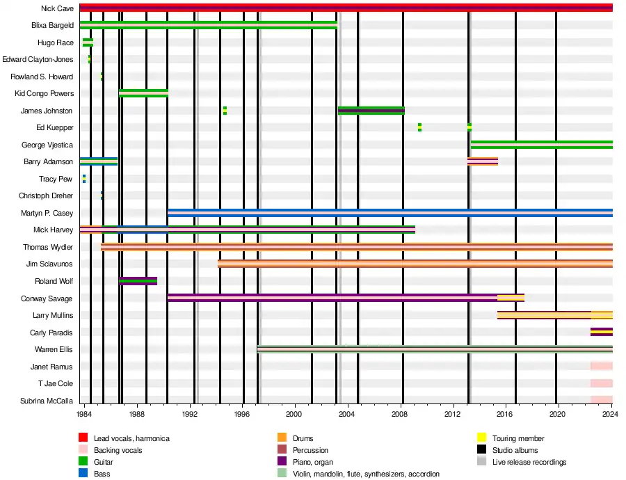 On 22 January 2009, it was announced that Harvey, the last remaining original member of the Bad Seeds besides Cave, had left the band in order to pursue other projects.[12] He was replaced for shows later in the year by Ed Kuepper.[13] After a brief hiatus, the band returned in 2013 with Push the Sky Away, during which time Barry Adamson returned to the band on drums and keyboards, filling in for Wydler who was absent to illness.[14] Kuepper briefly toured with the group again, before being replaced later by George Vjestica.[1] Adamson remained until early 2015, when Wydler returned to touring and keyboards were taken over by Larry Mullins (also known as Toby Dammit).[15] Savage was forced to leave the touring group in early 2017 after being diagnosed with a brain tumour.[16] He died the following September.[17]