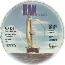 "Rolling Stone" is Suzi Quatro's debut solo single released in 1972. Quatro's name was misspelled Susie Quatro on the initial packaging. The single was not successful, except in Portugal, where it went to number one.[1]