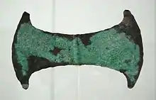The materials found in the graves included iron weapons, a horse harness, amber and glass beads, local and imported pottery, and ritualistic items. Graves from the sixth and fifth centuries BCE contain long iron bars that were placed in the tombs are a means of payment to the afterlife. They indicate that the tribe of the Dardani had developed a concept about the afterlife as shown later in other archaeological materials such as the votive monument of Smirë.[7] The weapons included double-edged axes (Labrys), which might have been used in a ritualistic manner related to sun worship that was prevalent in the northern Illyrian tribes.[8] Ancient Greek imports (pottery, weapons) at this period mark the beginning of more intense contact of the Dardani with the Mediterranean centers of antiquity. These burial materials attest to the fact that social differentiation had begun in Dardania and that they had a local elite class who could invest in luxury imports.