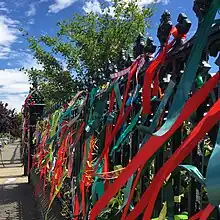 A community response during the Royal Commission into Institutional Responses to Child Sexual Abuse was "Loud Fence", which was started by St. Patrick's College school principal John Crowley who urged the public to tie ribbons to the school fence before the Royal Commission hearing commenced. He credits the idea and name to an unnamed local survivor, with another survivor coming up with the term "No more silence" in February 2014.[48] John was the person who tied the first ribbon.[49] By the day of the first hearing, ribbons had been tied to not only the school fence, but also to the fence of St Alipius Primary School, St Patrick's Cathedral, the entrances to Ballarat East, as well as outside the Ballarat Courts. Survivors at the hearing wore a ribbon pinned to their lapels. After the hearings had started, ribbons were taken down from St Alipius and some members of the community tied them back up. One of those, Maureen Hatcher, then started a Facebook page called "Loud Fence" which is still in operation.[50][51] Places that had a history of sexual abuse were marked with ribbons as a sign of support for the victims. The Loud Fence movement also spread internationally, with survivors taking it to Rome[52] and even speaking about it at a university in Rome.[53] There was also a Loud Fence march in Ballarat.[54] The diocese removed the ribbons three days after the Royal Commission in to Institutional Responses to Child Sexual Abuse published its final recommendations.[55][56]