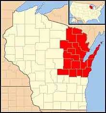 Brown, Calumet, Door, Florence, Forest, Kewaunee, Langlade, Manitowoc, Marinette, Menominee, Oconto, Outagamie, Shawano, Waupaca, Waushara and Winnebago[2]