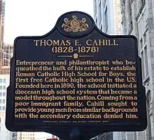 Dedicated: Tuesday, September 29, 2009. Location: E side of N Broad St., between Vine & Pearl, Philadelphia by the Historical Commission as referenced on the List of Pennsylvania state historical markers. Marker Text: Thomas E. Cahill "Entrepreneur and philanthropist who bequeathed the bulk of his estate to establish Roman Catholic High School for Boys, the first free Catholic high school in the US. Founded here in 1890, the school initiated a diocesan high school system that became a model throughout the nation. Coming from a poor immigrant family, Cahill sought to provide young men from similar backgrounds with the secondary education denied him."[10][11]