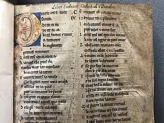 More than thirty manuscripts of Wace's Brut, either complete or fragmentary, are known to exist, though more fragments continue to be discovered from time to time. They were produced in roughly equal numbers in England and in France, demonstrating that it was a highly popular work in both countries.[81][82] Nineteen of these manuscripts give a more or less complete text of the poem, of which the two oldest are Durham Cathedral MS C. iv. 27 (late 12th century) and Lincoln Cathedral MS 104 (early 13th century).[83] Both of these manuscripts also include Geoffrey Gaimar's Estoire des Engleis and the chronicle of Jordan Fantosme, the three works forming in combination an almost continuous narrative of Britain's story from Brutus the Trojan's invasion up to the reign of Henry II.[84] This indicates that early readers of the Brut read it as history; however, later manuscripts tend to include Arthurian romances rather than chronicles, showing that the Brut was by then treated as fictional.[85]