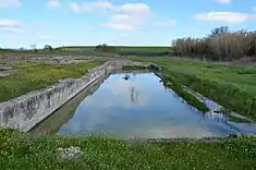 The villa is highlighted by its connection to a developed water collection and storage system. The Roman dam is located just north of the villa and includes an unreinforced 58 by 4.3 metres (190 ft × 14 ft) gravity dam reinforced by a 3 metres (9.8 ft) thick wall. The masonry and wedge bricks are specially constructed to support the structure, with gaps sealed with small stones. The dam closes a hydrological basin that extends to Beja, covering an area of 18.6 square kilometres (7.2 sq mi). It is assumed that the reservoir created from this dam occupied a length of 340 metres (1,120 ft) and area of 31,300 square metres (337,000 sq ft), holding a volume 38,000 cubic metres (1,300,000 cu ft). The dam helped to supply water for agriculture and recreational purposes (including the swimming pool and thermae) in the villa.[2]