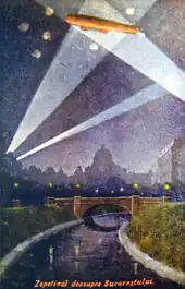 A few hours after Romania's declaration of war, Hauptmann Geissert (commander of zeppelin LZ 101, stationed at Yambol, Bulgaria) received the order to bomb Bucharest.[15] The zeppelins carried out raids on Bucharest, as well as on the oil refineries of Ploiești. On 4/5 September, while on a bombing raid over Ploiești, LZ 86 was hit by Romanian artillery, which damaged one of its gondolas. The zeppelin tried to return to the base in Timișoara but while on the way, the damaged gondola detached, causing the ship to become unbalanced. The airship crashed near Utvin, killing nine of its crewmen, including the commander. Another zeppelin, LZ 81, would also be damaged by anti-aircraft fire while over Bucharest on 26/27 September. The airship crash-landed near Tarnovo while trying to return to base.[20][21]