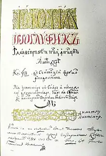 The first book printed in the Danubian Principalities was a Slavonic religious book, printed in 1508 at Dealu Monastery.[9] The first book printed in the Romanian language was a Protestant catechism of Deacon Coresi in 1559,[10] printed by Filip Moldoveanul.[11] Other translations from Greek and Slavonic books were printed later in the 16th century.[10] Dosoftei, a Moldavian Bishop, in 1673, published the first Romanian metrical psalter, the earliest collection of poems written in Romanian.[12][13]