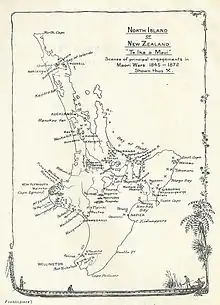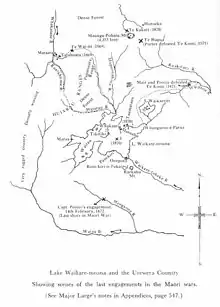 The Urewera country, to the west of East Cape, was rugged, mountainous terrain, and thickly forested, the home of the Ngāi Tūhoe iwi. The Government had alienated Tūhoe with confiscation of its most valuable land.[31] Te Kooti and around 30 acolytes soon gathered followers from among Tūhoe and mounted raids on Ohiwa and Whakatane for supplies and weapons.[1][32] His actions during these and later raids were particularly ruthless, and drew the ire of the iwi and hapu surrounding the Urewera country and encouraged them to support the Government.[33] Whitmore mounted an invasion of the Urewera country in early May, inflicting many casualties on the Tūhoe and destroying their homes and cultivated lands. Ngāti Porou warriors were slow to become involved in Whitmore's invasion of the Urewera country, only joining an expedition at Lake Waikaremoana in late May and that was withdrawn the following month after Te Kooti moved to the Taupo plains.[31][34]
