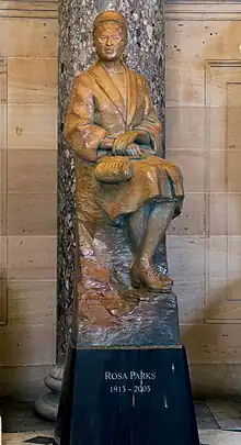 After retirement, Parks wrote her autobiography and continued to insist that there was more work to be done in the struggle for justice.[6] Parks received national recognition, including the NAACP's 1979 Spingarn Medal, the Presidential Medal of Freedom, the Congressional Gold Medal, and a posthumous statue in the United States Capitol's National Statuary Hall. Upon her death in 2005, she was the first woman to lie in honor in the Capitol Rotunda. California and Missouri commemorate Rosa Parks Day on her birthday, February 4, while Ohio, Oregon, and Texas commemorate the anniversary of her arrest, December 1.[7]
