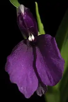 The single functional stamen has a yellow anther, about 6–9 mm (0.2–0.4 in) long, with 8–9 mm (0.3–0.4 in) long spurs formed from the connective tissue between the two capsules of the anther. The stigma is funnel-shaped.[2]