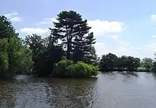 The island is tree-covered and has a narrow channel behind it crossed by a footbridge. It was formerly used for the growing of osiers (basket willows, used for basketry, furniture, and cart-making). The house on the island replaces the Swan Hotel which was formerly a well-known stopping point on the river.[1] The island was also known in the past as Kennington Island or St Michael's Island.