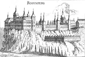 The first written record of Rosenburg dates back to 1175. The first castle on the site was erected in Romanesque style in the 12th century. Of this castle, only some of the foundations are preserved in the base of the current castle keep. Catholic Rosenburg was razed by Hussite forces in 1433. In 1476 the Rosenburg was vastly extended under the rule of Count Kaspar von Rogendorf, chamberlain of Emperor Frederick III. With this extension, the castle was transformed into the then-popular Gothic style. The current chapel and most of the outer-most walls are the best preserved examples of construction in this period. After this expansion, the Rosenburg served repeatedly as a stronghold of the Austrian armies in their struggle with Hungarian invaders. In 1487, the castle was sold to Jakob and Christoph Grabner from the Lord's Von Graben.[3]