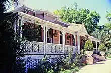 This large single-storeyed residence is on the slopes of Teneriffe Hill. It was constructed about 1886 for George Myers, a successful Brisbane china and glassware merchant whose principal store was located in Queen Street. In 1889, he also erected a warehouse in Edward Street (now the Metro Arts Theatre).[1] The site originally was part of James Gibbon's Teneriffe estate. Myers had purchased it in 1885 from architect and newspaper proprietor James Cowlishaw, and it is possible Cowlishaw produced the design.[1] The residence was called Roseville, reputedly because of the large rose garden Myers established in the grounds.[1]