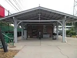 Between the 1960s and the 1980s, the area surrounding the station underwent a large-scale urban renewal project.[16][17][18][19] As part of the project, a number of derelict buildings – in addition to portions of the abandoned freight yard – were demolished and replaced with a 250-car parking lot for the station. The project also saw the station be moved to the south side of Lincoln Avenue; the historic station house was moved to this new location in 1988, where it continues to stand today.[16][19][20][21] When the station was moved to its current location, the Village of Roslyn expressed interest in moving the station's historic platform shelter into Roslyn's downtown to ensure its preservation; the structure, by that time, was used as a taxi stand.[22] The shelter, built in 1928, was moved in 1987 to the site of the Captain Jacob M. Kirby Storehouse on Main Street, where it remains standing as a garden house.[22]