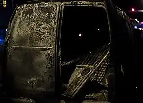 A Baltimore Police Department van, similar to the one which carried Freddie Gray, burnt during the subsequent 2015 Baltimore protests
