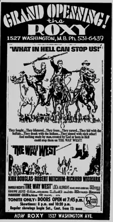 The Roxy, billed as "Miami Beach's newest and most fabulous theatre," opened on Friday, July 21, 1967.[3] For its grand opening, the theater premiered The Way West, starring Kirk Douglas, Robert Mitchum, and Richard Widmark.