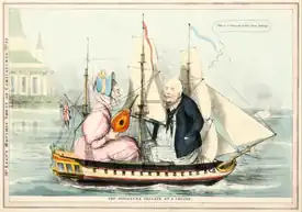 A satirical cartoon depicting King William IV and Queen Adelaide sailing in the Royal Adelaide, circa 1834. The actual yacht was 50 feet (15 m) long.