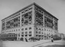 The Canadian Pacific began plans for a major hotel in Winnipeg in 1899. That year, president Thomas Shaughnessy unveiled plans for a combined station and hotel that was similar in concept to Place Viger in Montreal. The building was designed by Edward Maxwell and was drawn by David MacFarlane (later of Ross and MacFarlane), who was working in Maxwell's office at the time. The massing of the structure may have influenced MacFarlane's subsequent design of the Hotel Macdonald in Edmonton.[1] Maxwell preferred the building to be constructed of white stone and white brick, while company officials favoured red sandstone and Lac du Bonnet brick. The CPR's inability to acquire all the land necessary for the project prevented it from going forward.[2]