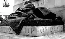 The Royal Artillery Memorial is 43 feet long, 21 feet wide and 30 feet high (13 metres by 6 metres by 9 metres); the pedestal and the one-third over-lifesize replica of a BL 9.2-inch howitzer, modelled on a gun in the Imperial War Museum, that sits on top of it are made of Portland stone.[3][7][37] The plinth is in the form of a squat Roman cross. Cast by the A. B. Burton foundry, bronze figures are placed at the ends of each arm—an artillery captain holding a greatcoat at the front (facing south, below the barrel of the howitzer); a shell carrier on the east side; a driver wearing a heavy cape to the west; and to the north, a dead soldier on the north, his greatcoat thrown over him and his helmet resting on his chest.[38][39][40][41] Carved stone reliefs show various detailed military scenes from the First World War—two on each side, one larger than the other—and the Royal Arms with the Artillery's cannon badge. The reliefs on the east side portray an action by heavy artillery and the crew of a howitzer; on the west side is an action involving horse artillery and a signaller and telephonist on the smaller relief.[41][42] The memorial's main inscription on the west and east faces reads "In proud remembrance of the forty-nine thousand and seventy-six of all ranks of the Royal Regiment of Artillery who gave their lives for King and country in the Great War 1914—1919".[43] Beneath the dead soldier is the inscription "Here was a royal fellowship of death", a quote from William Shakespeare's Henry V, which was suggested by Jagger himself.[30][41]