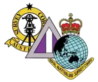 - ↑ Depicted is the crest and motto of the Royal Australian Survey Corps (RA Svy) as it existed at cessation in 1996. It replaced the original badge of the Australian Survey Corps approved in 1915. The crest was approved in 1949 with the King's crown and modified in 1953 with the Queen's crown. The motto was approved in 1965.[1]