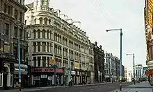 The city's most prestigious and elegant hotel, the Grand Central Hotel, was on the street before it was demolished in the late 1980s to make room for the £40 million shopping complex, Westfield CastleCourt.[2] The site on which it was built by John Robb was originally intended to be a central railway terminus; however, due to hesitation on the part of town councillors, Robb constructed a 200-room luxury hotel instead.[3] The hotel, which first opened its doors on 1 June 1893, became the "social hub of Belfast" and provided a temporary home for many illustrious guests, including King Leopold III of Belgium, Sir Winston Churchill, Gene Autry, Bob Hope, The Beatles, and the Rolling Stones.[3] The latter's presence inside the hotel in the mid-1960s nearly provoked a riot as hundreds of fans gathered in Royal Avenue to catch a glimpse of the bandmembers, who watched the chaotic scene taking place below from the hotel's upper windows.[3] A year after the hotel closed down in 1971, it was converted into a fortified military barracks serving as battalion headquarters for regiments in the British Army that were based in Belfast city centre.[2] The former hotel's Bridal Suite became the Army's operational centre for over ten years.