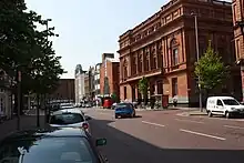Looking south on Royal Avenue, there is an imposing vista of Belfast City Hall and Donegall Square. The Anglican St. Anne's Cathedral in Donegall Street is adjacent to its northern end. It has many Victorian and Edwardian buildings, including the Belfast Central Library and the Haymarket Building, along with newer, modern structures and shopping complexes. It serves as the headquarters for the Belfast Telegraph newspaper. Like the rest of the city centre, Royal Avenue has seen much redevelopment since the Troubles officially ended in 1998, and the city embarked on a major urban renewal project.
