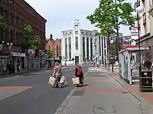 Royal Avenue is one of the main commercial centres in Belfast. Shops currently on the street include branches of Primark, Tesco, H&M, and Schuh, as well as major banks including Santander UK, HSBC, and the Nationwide Building Society. Westfield CastleCourt, a major shopping centre owned by the Westfield Group, is also on Royal Avenue, and as of 2023, it hosts over 100 stores, including New Look, Superdrug, Burton, Argos, Games Workshop, and Virgin Media.[9] The centre occupies the former site of the Grand Central Hotel.