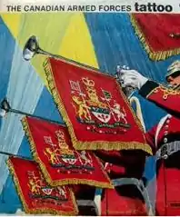 A poster for the Canadian Armed Forces Tattoo 1967 depicting members of the Royal Canadian Dragoons Band with fanfare trumpets.