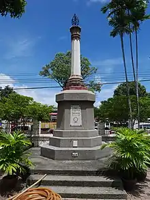 This monument is shaped like a prang mounted on a four-sided pedestal of grey and white marble.