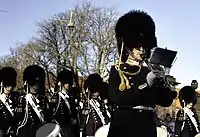 Today, the band performs throughout Denmark and abroad. The DKLM's area of responsibility accounts for the national capital, Copenhagen. When on parade, they wear the full dress uniform of the Life Guards (a scarlet tunic, blue trousers, and a bearskin cap). It is mainly seen accompanying the Guard Company when it executes the changing of the guard in front of Amalienborg, where the band plays traditional military marches. It takes part in the annual Tattoo of Den Kongelige Livgarde at Rosenborg Castle. The repertoire of the DKLM of today is very diverse and spans a lot of genres. The band almost exclusively plays Kong Christian stod ved højen mast, the Royal anthem, in the presence of the monarch or other Danish members of the House of Glücksburg. In addition, to its ceremonial role, musicians of the DKLM are trained infantryman who serve with the regiment.[2]