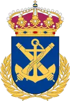 The coat of arms of the Royal Swedish Naval Academy 1867–1987. It was later used by the Swedish Navy Staff College (Marinens krigshögskola, MKHS) from 1987 to 1998 and the Swedish Naval Warfare Centre since 2005. Blazon: "Azure, an anchor erect cabled surmounting two gunbarrels of older pattern, or. The shield surmounted an open chaplet or."[11]