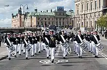 The Royal Swedish Navy Cadet Band (RSwNCB) (Swedish: Marinens ungdomsmusikkår, MUK) is a symphonic wind band with military traditions, and was created in 2002 as a non profit organization in cooperation with the Swedish Armed Forces Music Corps and the Royal Swedish Navy Band. The RSwNCB is the only young band in Sweden, alongside the former conscript bands, which has been approved for and performed at the ceremony of the Changing of the Royal Guards at the Stockholm Palace in Stockholm.