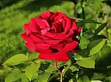 The dark red flowers develop from even darker, pointed buds. They reach an average diameter of 13 centimetres (5.1 in)[3] and have a strong fragrance. The vigorous shrub has dark green foliage, reaches a height of 75–125 centimetres (30–49 in) at a width of 60–75 centimetres (24–30 in), is winter hardy up to −20 °C (−4 °F) (USDA zone 6b)[4] and very disease resistant. Due to their long, solid stems, the roses are well suited as cut flowers.