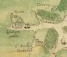 The name Lanihorne is perhaps a modified form of Laryhorn (the Cornish name of this place). The village was, from the mid 12th century onwards, the site of an adulterine castle of the Arcedekne family and the main settlement was at Sheepstor (Sheepstall) some distance away towards Tregony (where the Pomeroy family also built a castle). In 1334 John Arcedekne was granted permission for the castle by Edward III. Before the castle was demolished in the 19th century, it was described as having a 40 ft high keep, seven or eight towers and possibly an outer court.[4][5][6]