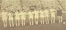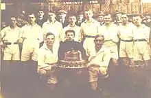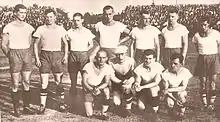 In autumn of 1920 Ruch won the promotion to the nascent Silesian Klasa A (see also: Lower Level Football Leagues in Interwar Poland). The Blues were third out of fourteen teams in its first season, unfinished due to the third Silesian Uprising. The next year Ruch won the championship of the Silesian Klasa A and represented the region in the 1922 Polish Football Championship. In 1924 the club finished second in the regional top league, behind AKS Królewska Huta, before 1924 considered German and known as Verein für Rasenspiele Königshütte, the first team Ruch had developed a local rivalry with. In 1925 the Silesian Klasa A did not play, instead Stanisław Flieger's Cup took place, ultimately won by Ruch, which gave the side a start in the only interwar Polish Cup competition in 1926. On 4 July 1926 Józef Sobota, before 1920 a BBC's player, became the first Ruch's player (and the fourth from Upper Silesia) of the Poland national team, who also scored a goal (against Estonia). In the same year, two weeks after the national Cup Ruch won for the second time the regional Klasa A, firmly establishing itself as one of the strongest football clubs in this densely populated region and as such it was among the founding clubs of the Polish national league in 1927. In 1933 Ruch won its first Championship as the first side from Silesia, with all the players who were born not further as a few kilometers from the na Kalinie pitch.[7] Thus the first truly golden era began. The local steel mill (since 1934 known as Huta Batory) began to financially support the side. In the winter of 1933 the most noteworthy players such as Edmund Giemsa, Teodor Peterek and Gerard Wodarz were joined by legendary Ernst Wilimowski, bought from 1. FC Kattowitz, who with Peterek and Wodarz were collectively nicknamed the three kings and helped to win another 4 championships (1934, 1935, 1936, 1938). On 1 November 1934 the club, as the last in the league, employed its first coach, Gustav Wieser.[8] The side was also a leader in the unfinished season 1939. The successes rendered the club the most popular in the voivodeship and accelerated building of the new stadium in the years 1934-1935, the current Ruch Stadium.