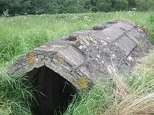 The Ruck machine gun post or Ruck pillbox is a type of hardened field fortification built in Britain during the invasion crisis of 1940–1941. It was designed by James Ruck and was made from prefabricated concrete sections and paving slabs, sandbags and rammed earth.[2][3] The Ruck machine gun post was relatively widely used in Lincolnshire and along the east coast of England,[4] but is now extremely rare with just a handful of extant examples.[5] Today, just five Ruck machine gun post sites are recorded in the Defence of Britain database.[6]