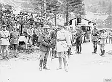 After reverses on the Western Front in March and April 1918, Prime Minister Lloyd George and the War Cabinet had been keen to remove Field Marshal Sir Douglas Haig as C-in-C of the BEF, but had been unable to think of a suitable successor. In July Cavan was summoned to London, supposedly to discuss the Italian Front but in reality, as Cabinet Secretary Maurice Hankey put it, "to 'vet' him with a view to his replacing Haig" Hankey claimed to have dissuaded the Prime Minister by pointing to Cavan's lack of ideas as to how to defeat the Austro-Hungarians.[35] Haig's victory at Amiens in August secured his position.[36]