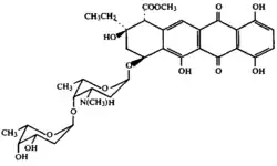 The individual components of bohemic acid are orange-red solids, the color originating from an optical absorption band centered at about 490 nm. Marcellomycin and mimimycin, and collinemycin and musettamycin are stereoisomers, that is they have the same chemical compositions; however, one C-H and one COOCH3 group exchange places. Those two groups are attached to the same carbon atom of one carbon ring, they are marked by the blue star in their structure in the table (C-H group is not shown).[7] Nearly all components of bohemic acid are anthracycline antibiotic agents active against Gram-positive bacteria, but not against Gram-negative bacteria, yeasts or fungi. The most potent component of the acid is rudolphomycin[1] and the least potent is schaunardimycin, which is about 10 times weaker than musettamycin and 20 times weaker than marcellomycin.[8] The original studies on the individual components of bohemic acid have tested them all for antitumor activity in mice, upon intraperitoneal injection.[1][8] Furthermore, the antitumor pharmacokinetics of marcellomycin in the human blood has been evaluated both in vitro and in vivo.[9][10][11][12]