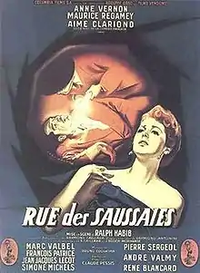 Rue des Saussaies is a 1951 French crime drama film directed by Ralph Habib and starring Anne Vernon, Maurice Régamey and Aimé Clariond.[1] It takes its name from the Rue des Saussaies, a Paris street. The film's sets were designed by the art director Paul Bertrand.