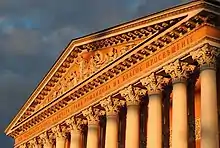 An architect was involved in the conversion of the house(s) into a museum.[22] It was at this stage in the mid-1830s when 12 columns were added to the front built up from the first floor.[22] A pediment was added with sculpting by Ivan Martos.[22] The sculpting on the pediment is inspired by mythology connected with Mount Parnassus, Apollo-Musagets, Mnemosyne and the Muses, a shout-out to the buildings' purpose as a museum as well as a reference to Rumyantsev.[23] At a later date the pediment was engraved with the words of Nikolay, "for (the) good (of) enlightenment",[lower-alpha 2] also translated as "for the benefit of education",[27] with the entire engraving reading as, "From the State Chancellor Count Rumyantsev for the good enlightenment" (Russian: ОТb ГОСУДАРСТВЕННОГО КАНЦЛЕРА ГРАФА РУМЯНЦЕВА НА БЛАГОЕ ПРОСВЕЩЕ).[16][28]