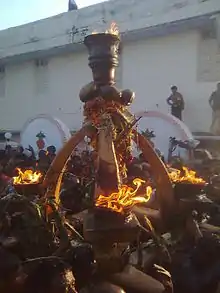 The "Palli" is a made from the wood of tree "khijada" on the same day itself. It is a wooden frame of about 8–9 feet height with stand to lift it. Holy fire (Akand Jyoth) kept at 5 places on the frame, one at the top and other at the four corners of the Palli.
