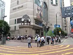 Russell Street used to be a traditional Chinese wet market where hawkers sold vegetables, fruits, meats and groceries. Dai pai dong (cooked-food stores) could also be found along the street. Due to the lack of hygiene and sanitation knowledge at that time, mice infestation was very serious in there—people even called Russell Street the "Mouse Street".[6] The Jian family, in 1905, founded The Nanyang Brothers' Tobacco Co., based in Russell Street. Due to the intense rivalry with the monopoly, British American Tobacco company, the Jian family declared bankruptcy and closed the factory in 1908. In the 1920s, Hong Kong Tramways built a tram depot by Russell Street, mainly for tram repair and parking. As the demand for tram service grew, the old Russell Street tram depot could no longer park all the trams Hong Kong Tramways owned. The company decided to expand the Russell Street depot, and at the same time built a temporary tram depot in North Point to ease tram parking problem. In 1951, Hong Kong Tramways finished the renovation of Russell Street depot, renamed it as Sharp Street depot. The North Point temporary tram depot was then closed.[7] Not long after the expansion of the Russell Street tram depot, the Tramway workers resented Hong Kong Tramways for unjustifiable dismissal and break of employment contract, which eventually caused a labour dispute in 1952. In 1989, Lockhart Road market reconstruction completed. Hawkers and Dai Pai Dong on Russell Street all moved into the new Lockhart Road market. The Sharp Street depot (formerly Russell Street depot) was shut down and demolished. All trams were moved to Sai Wan Ho and Whitty Street depot. The site of Russell Street was then reconstructed into Times Square.
