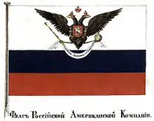 The Russian commercial flag (civil ensign) was used between 1799 and 1806 by the company on its ships and establishments. Tsar Alexander I approved a design for a separate flag for the RAC on 10 October 1806 O.S., writing "So be it" upon the report.[32] After being sent to the State Council, it was forwarded to the Finance and Naval ministries, along with the Saint Petersburg office of the RAC on 19 October 1806 O.S.[33] The memorandum described the flag as having "three stripes, the lower red, the middle blue, and the upper and wider stripe white, with the facsimile on it of the All-Russia state coat-of-arms below which is a ribbon hanging from the talons of the eagle with the inscription thereon 'Russo-American Company'".[33]
