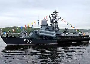 Small missile ships of the Project 1234 (NATO classification Nanuchka-class) corvette is a series of Soviet small missile ships (MRK) of the 3rd rank built at shipyards of the USSR from 1967-1992.[2]